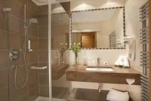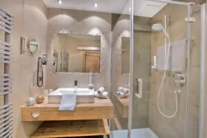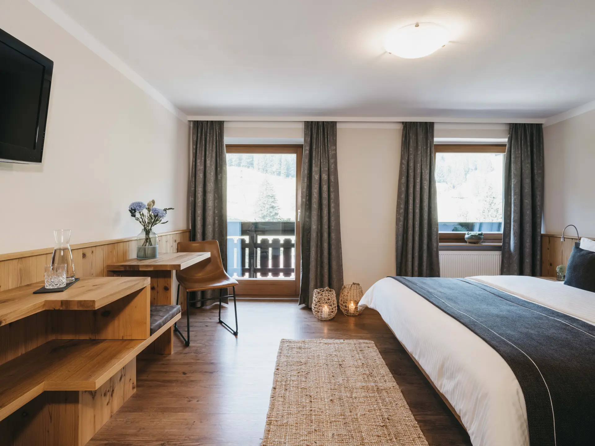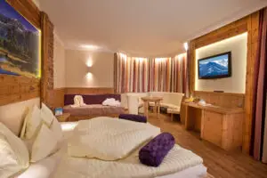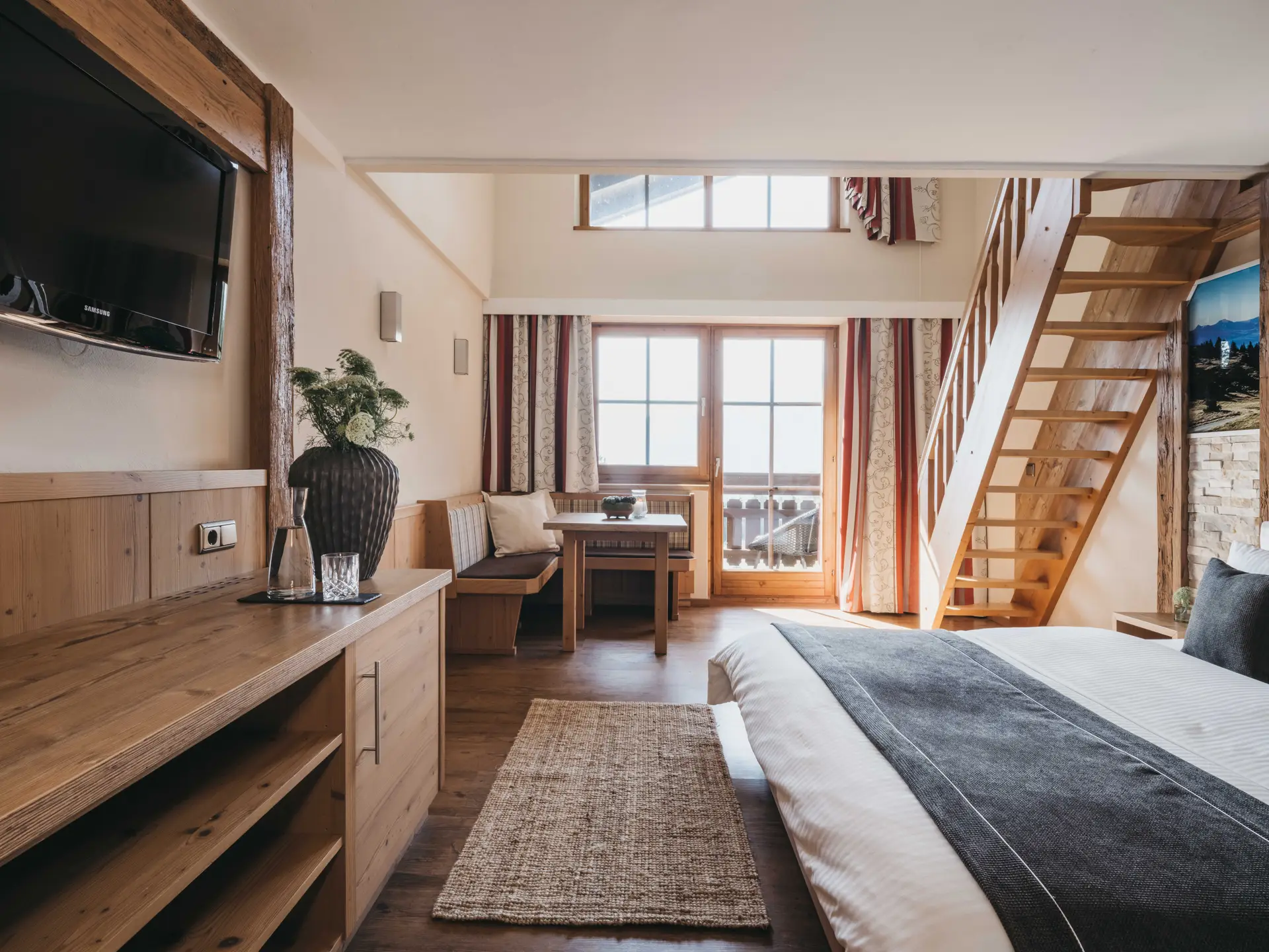 Familienzimmer „Galerie“ Das 45m² große Zimmer auf zwei Ebenen ist mit einer gemütlich stilvollen Holzeinrichtung ausgestattet. Das helle Zimmer verfügt über Dusche, sep. WC, Allergikerboden, Balkon, Safe, Föhn, SAT-LCD-TV mit Multi-Media-Anschlüssen, Telefon, Sitzbereich, Nichtraucher